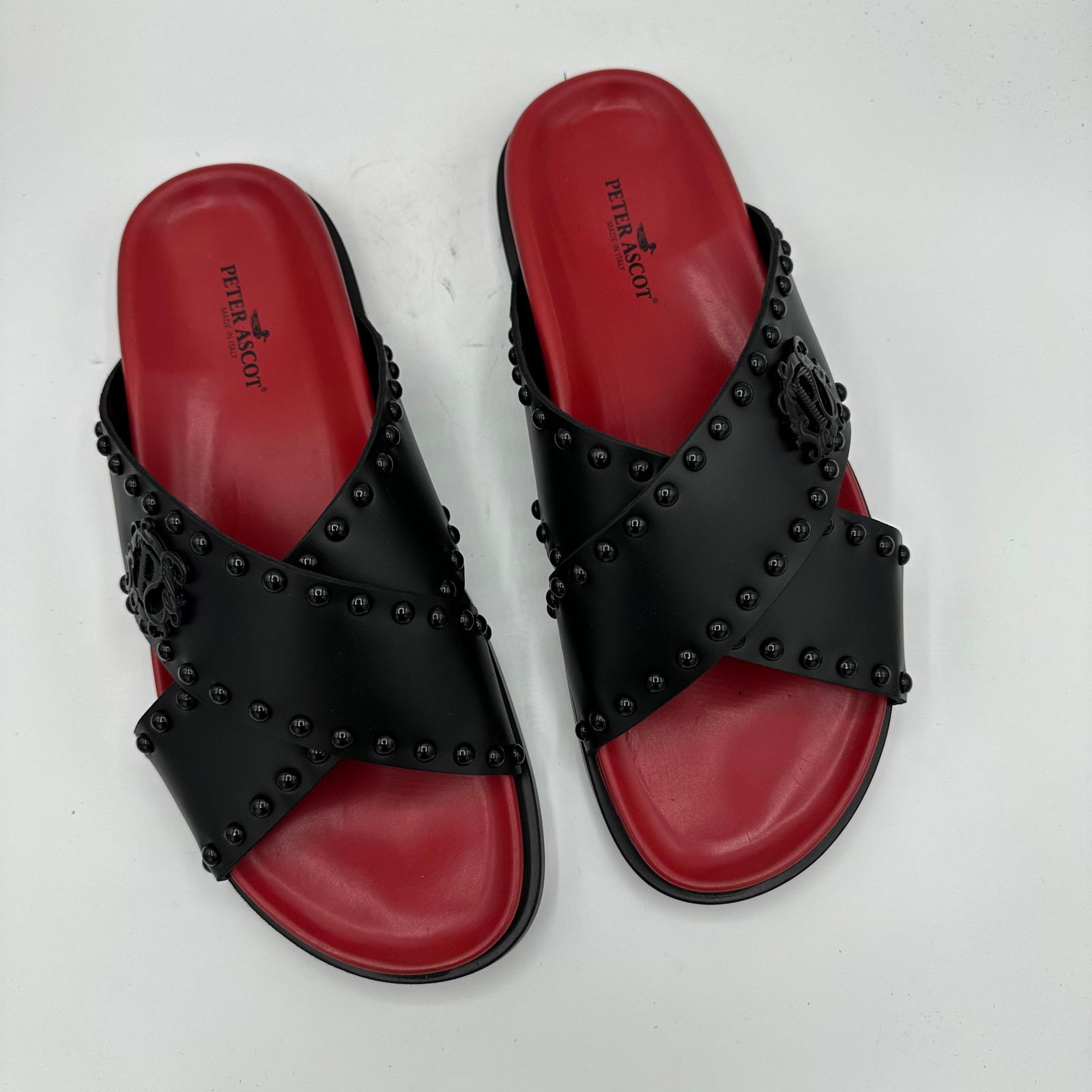 Italian leather palm slippers for men, available in black and a red inner sole. Condition: New